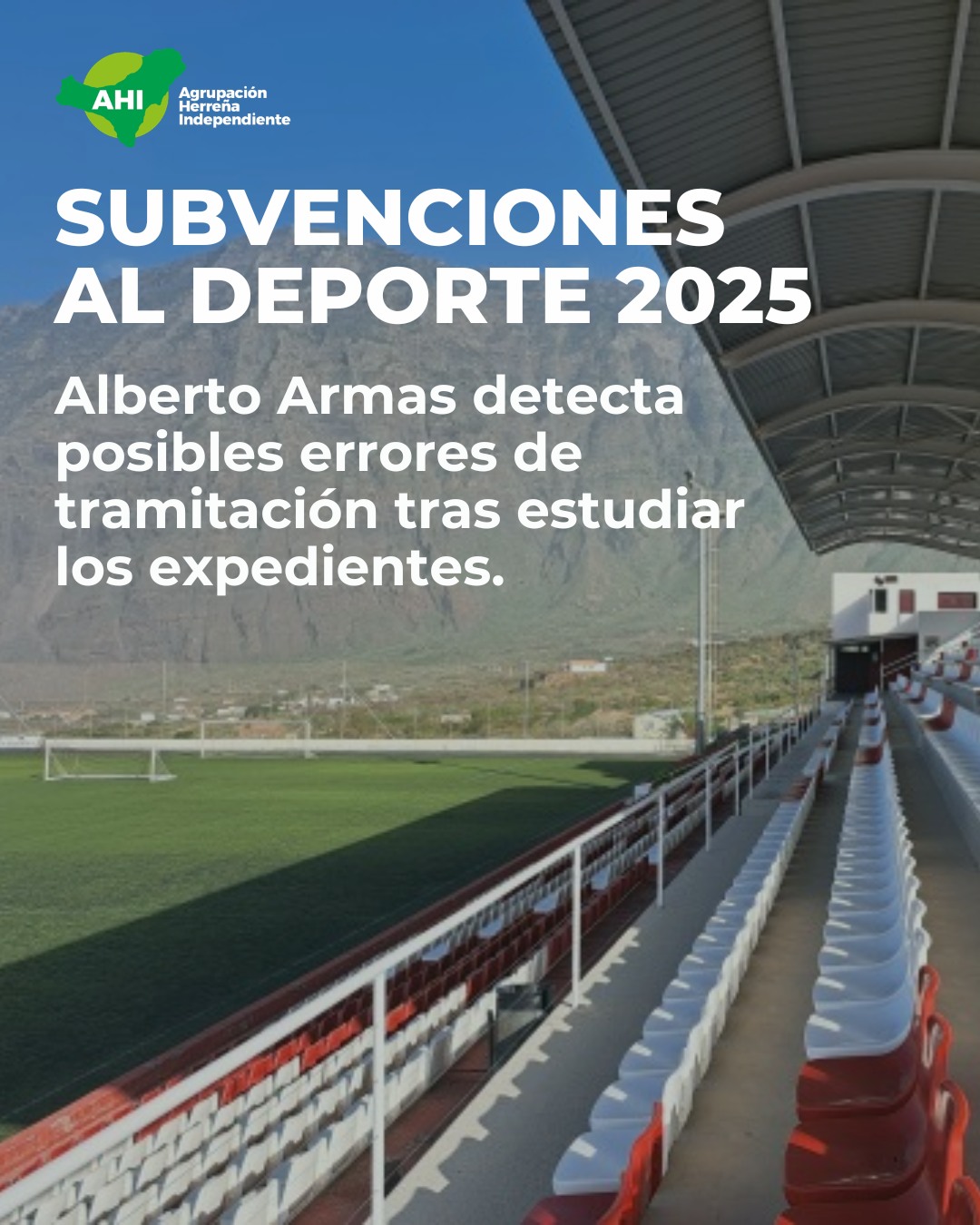 El consejero de la Agrupación Herreña Independiente en el Cabildo de El Hierro, Alberto Armas, ha estudiado los expedientes de la convocatoria de subvenciones al deporte herreño correspondiente al año 2025, detectando posibles errores de tramitación que hacen necesario revisar el procedimiento para garantizar la igualdad de trato entre todos los solicitantes.